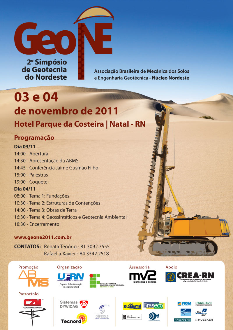 A cidade de Natal, no Rio Grande do Norte, receberá o 2° Simpósio de Geotecnia do Nordeste. O evento acontece entre os 3 e 4 de novembro, no Hotel Parque da Costeira. No primeiro dia, haverá apresentação da ABMS ao público, além da Conferência Jaime Gusmão. Já no segundo dia, fundações, estruturas de contenções, obras de terra e geossintéticos e geotecnia ambiental serão os quatro temas em pauta. Para mais informações, consulte o folder do evento.