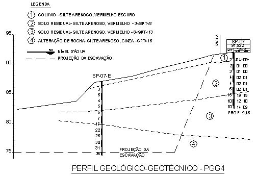 Para desenvolvimento do projeto foram efetuadas investigações geotécnicas com execução de sondagens a percussão para definição das camadas representativas do subsolo, como pode ser observado em um dos perfis geológico-geotécnicos dos trechos típicos do talude apresentado a seguir.