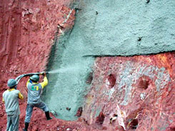 Durante a execução das obras a Dýnamis efetuou o Acompanhamento Técnico das Obras, fornecendo toda orientação técnica referente aos procedimentos de engenharia geotécnica através de visitas de um engenheiro geotécnico de sua equipe. A foto ao lado mostra a execução do paramento em concreto projetado.