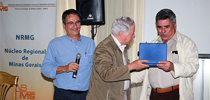 Logo após a apresentação, houve um tempo de debate e, em seguida, o palestrante foi homenageado pelos colegas do Núcleo Regional de Minas Gerais com a entrega de uma placa. O responsável pela entrega da placa em nome do NRMG foi o engenheiro Euler Magalhães da Rocha, que é um dos poucos pioneiros da Geotecnia que ainda se encontra em plena atividade profissional.