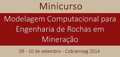A ABMS, através do Comitê Brasileiro de Mecânica das Rochas e do Núcleo Regional Centro-Oeste, vai realizar nos dias 9 e 10 de setembro de 2014, das 8h30 às 17h30, o Minicurso de Modelagem Computacional para Engenharia de Rochas em Mineração. O minicurso será realizado paralelamente ao XVII Congresso Brasileiro de Mecânica dos Solos e Engenharia Geotécnica (COBRAMSEG 2014) e ao VI Simpósio Brasileiro de Mecânica das Rochas, no Centro de Convenções de Goiânia.