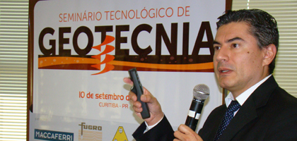 Estabilidade de taludes, erosão de solo, fundações, ensaios de campo, monitoramento a laser de áreas para fins de mapeamento e ocorrências carste foram alguns dos temas abordados no Seminário Tecnológico de Geotecnia, ocorrido no dia 10 de setembro de 2013 em Curitiba, no Paraná. O evento foi organizado pelo Instituto de Tecnologia para o Desenvolvimento (Lactec) e contou com as palestras de reconhecidos profissionais, dentre eles o secretário geral da ABMS e professor da Universidade Federal do Paraná, Alessander C. Morales Kormann, e o ex-presidente do Comitê de Mecânica das Rochas da ABMS, Milton Kanji. (Na foto: Alessander Kormann durante palestra)