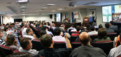 Alonso demonstrou em sua palestra como se deve executar uma estaca hélice contínua dentro da boa técnica, o funcionamento da monitoração eletrônica - que não deve ser confundido com controle de execução -, bem como seus perigos de interpretação e os principais problemas de execução e como devem ser evitados. (Na foto ao lado, o engenheiro Urbano Alonso durante palestra - Foto: Ike Vianna. Clique na imagem para visualizá-la maior)