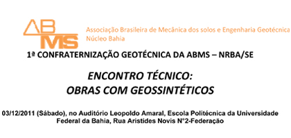 O Núcleo Bahia da ABMS promove, no dia 3 de dezembro, a sua 1ª Confraternização Geotécnica. A programação do encontro técnico conta com quatro palestras com enfoque em geossintéticos. O engenheiro Paulo Rocha apresentará o tema "Ensaios em Geossintéticos". Já Carlos Carrilho será o debatedor do tema "Obras de contenção com Geossintéticos" em Salvador. Sobre "Patologias em Obras com Geossintéticos", o palestrante será o professor Ennio Palmeira. Alberto Sayão, ex-presidente da ABMS, ministrará a última apresentação do evento, sobre o livro "A história da Engenharia Geotécnica no Brasil".