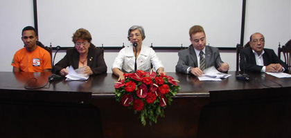 A Escola Politécnica da Universidade Federal da Bahia (UFBA), com o apoio do Núcleo Bahia da ABMS, da ABGE (Associação Brasileira de Geologia de Engenharia e Ambiental) e da SBG (Sociedade Brasileira de Geologia), promoveu, no dia 7 de abril, o workshop "Áreas de Risco de Deslizamento: Identificações, Responsabilidades, o que fazer?". "O objetivo do evento não foi identificar culpados", explica Luis Edmundo Prado de Campos, presidente do Núcleo Bahia da ABMS. "Mas reunir todos os atores envolvidos e dar as mãos para entender o problema e tomar providências para que tragédias não voltem a acontecer". O evento reuniu 150 participantes, além de espectadores que puderam acompanhar o debate pela internet. Na foto, Francisco, representante da comunidade, Maria del Carmem, deputada estadual, Dora, reitora da UFBA, Cássio Peixoto, chefe de gabinete do Ministério das Cidades e Jonas Dantas, presidente do CREA-BA.